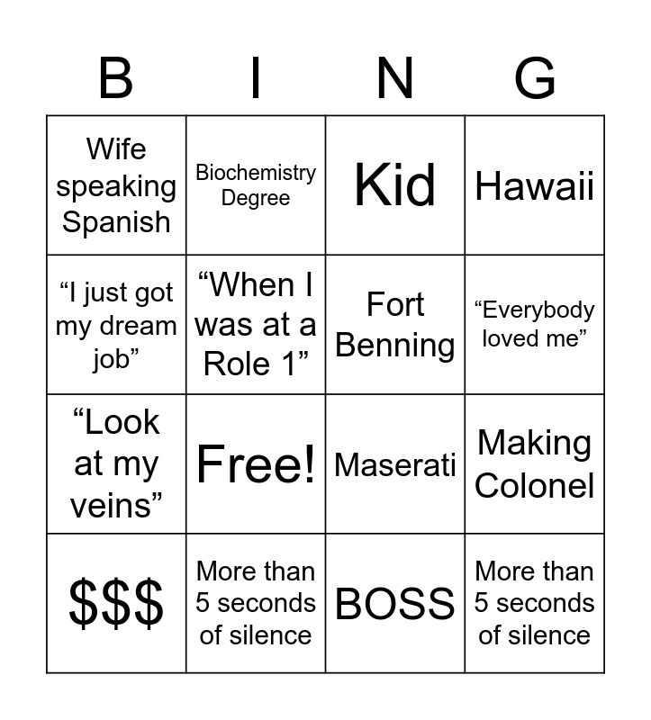This bingo card has 18 words: Free!, More than 5 seconds of silence, Kid, Wife speaking Spanish, Maserati, Hawaii, $$$, Biochemistry Degree, “Everybody loved me”, “Look at my veins”, BOSS, “I just got my dream job”, Making Colonel, “When I was at a Role 1”, Fort Benning, DO/Chiropractor, More than 5 seconds of silence and Speaking up in a group.