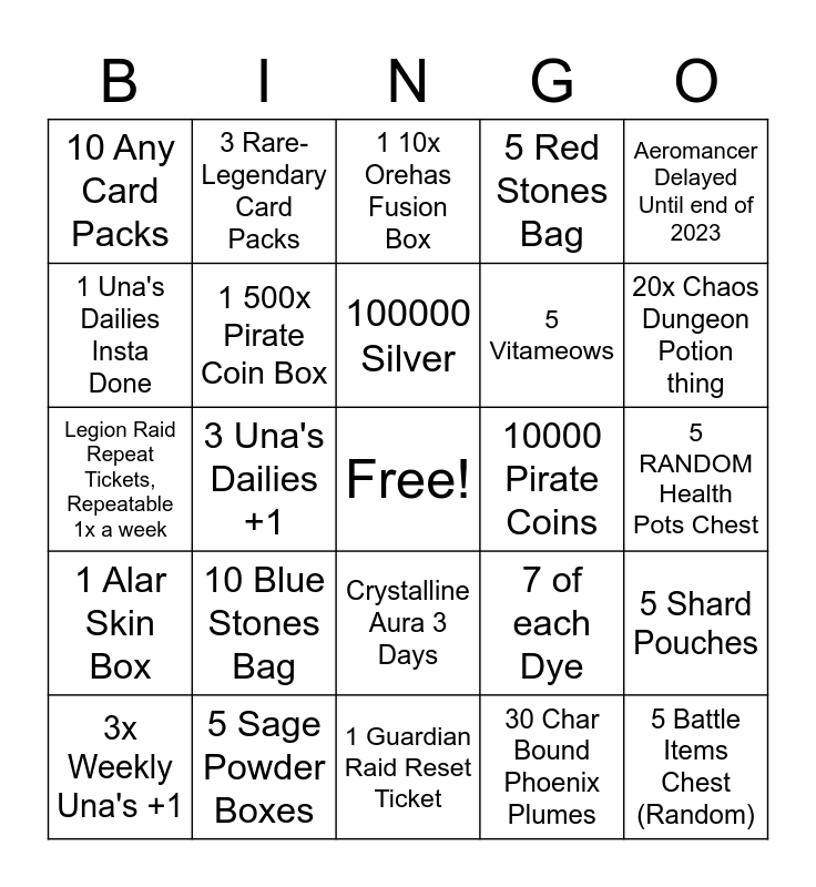 This bingo card has a free space and 24 words: 10 Blue Stones Bag, 5 Sage Powder Boxes, 100000 Silver, 3x Weekly Una's +1, Aeromancer Delayed Until end of 2023, 10 Any Card Packs, 1 Una's Dailies Insta Done, 3 Rare-Legendary Card Packs, 10000 Pirate Coins, Crystalline Aura 3 Days, 5 Vitameows, Legion Raid Repeat Tickets, Repeatable 1x a week, 7 of each Dye, 5 Shard Pouches, 1 500x Pirate Coin Box, 30 Char Bound Phoenix Plumes, 5 RANDOM Health Pots Chest, 1 10x Orehas Fusion Box, 20x Chaos Dungeon Potion thing, 3 Una's Dailies +1, 5 Battle Items Chest (Random), 1 Alar Skin Box, 5 Red Stones Bag and 1 Guardian Raid Reset Ticket.