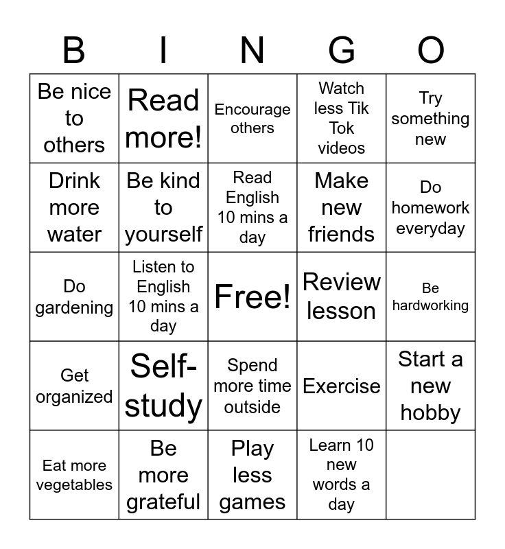 This bingo card has a free space and 24 words: Get organized, Be more grateful, Spend more time outside, Exercise, Try something new, Be nice to others, Read more!, Encourage others, Make new friends, Start a new hobby, Drink more water, Be kind to yourself, No falls!, Review lesson, Do homework everyday, Eat more vegetables, Listen to English 10 mins a day, Read English 10 mins a day, Watch less Tik Tok videos, Be hardworking, Do gardening, Self-study, Play less games and Learn 10 new words a day.