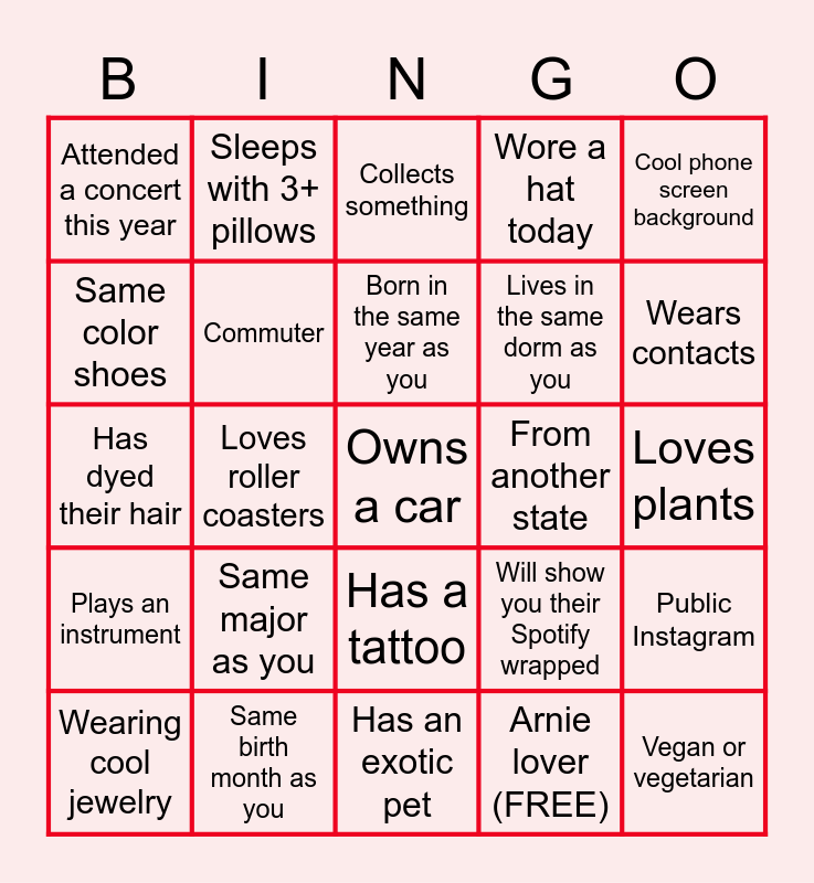 This bingo card has 30 words: Same birth month as you, Knows how to read tarot, Loves roller coasters, Can do a cartwheel, Attended a concert this year, Collects something, Commuter, Has a tattoo, From another state, Has an exotic pet, Loves plants, Owns a car, Arnie lover (FREE), Vegan or vegetarian, Wears contacts, Plays sports, Will show you their Spotify wrapped, Plays an instrument, Same major as you, Cool phone screen background, Has dyed their hair, Can cook, Sleeps with 3+ pillows, Lives in the same dorm as you, Same color shoes, Wore a hat today, Public Instagram, Wearing cool jewelry, Born in the same year as you and Uses a paper planner.