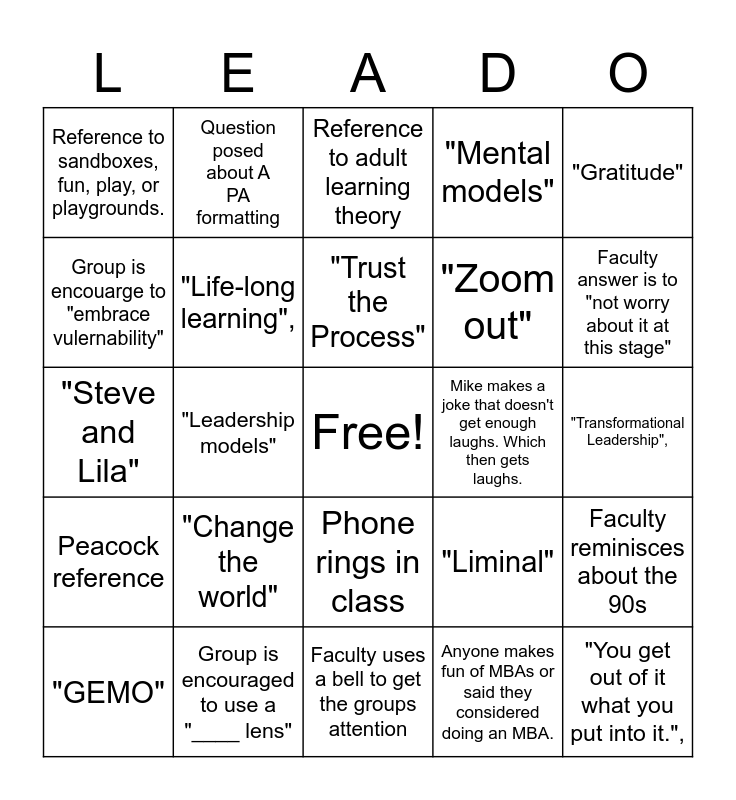 This bingo card has a free space and 29 words: "GEMO", "Higher education", "Leadership models", Contrasts the experience with undergradate studies, Reference to sandboxes, fun, play, or playgrounds., Reference to adult learning theory, "Life-long learning",, "Change the world", Mike makes a joke that doesn't get enough laughs. Which then gets laughs., Group is encouraged to use a "____ lens", "Transformational Leadership",, "You get out of it what you put into it.",, Faculty uses a bell to get the groups attention, Anyone makes fun of MBAs or said they considered doing an MBA., Faculty answer is to "not worry about it at this stage", Anyone encourages "self care" to the group, Phone rings in class, Peacock reference, "Gratitude", "Steve and Lila", "Liminal", "Honoured", "Zoom out", Group is encouarge to "embrace vulernability", "Mental models", Question posed about APA formatting, Faculty reminisces about the 90s, "Trust the Process" and Castle reference.