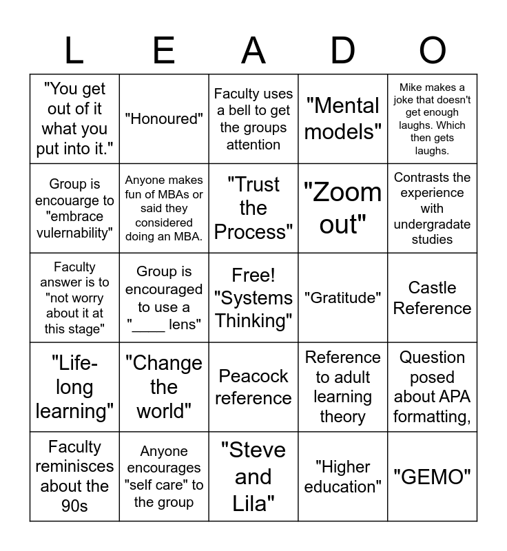 This bingo card has a free space and 30 words: Anyone encourages "self care" to the group, Phone rings in class, Group is encouraged to use a "____ lens", "Transformational Leadership", "You get out of it what you put into it.", Faculty uses a bell to get the groups attention, Anyone makes fun of MBAs or said they considered doing an MBA., Peacock reference, "Gratitude", "Steve and Lila", Castle Reference, "GEMO", "Higher education", "Leadership models", Contrasts the experience with undergradate studies, Reference to sandboxes, fun, play, or playgrounds., Reference to adult learning theory, "Life-long learning", "Change the world", Mike makes a joke that doesn't get enough laughs. Which then gets laughs., Faculty answer is to "not worry about it at this stage", "Liminal", "Honoured", "Zoom out", Group is encouarge to "embrace vulernability", "Mental models", Question posed about APA formatting,, Faculty reminisces about the 90s, "Trust the Process" and Someone opens a noisy snack.