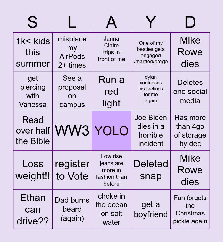 This bingo card has a free space and 28 words: Mike Rowe dies, Stephanie losses her hearing aids for more than a month, dylan confesses his feelings for me again, get a boyfriend, get piercing with Vanessa, Janna Claire trips in front of me, misplace my AirPods 2+ times, Loss weight!!, Joe Biden dies in a horrible incident, Ethan can drive??, Read over half the Bible, One of my besties gets engaged /married/prego, Dad burns beard (again), choke in the ocean on salt water, Deletes one social media, Made 5 new playlist, register to Vote, See a proposal on campus, Run a red light, Low rise jeans are more in fashion than before, 1k< kids this summer, Hit an animal in me car, Fan forgets the Christmas pickle again, WW3, Has more than 4gb of storage by dec, Deleted snap, Mike Rowe dies and Mike Rowe dies.