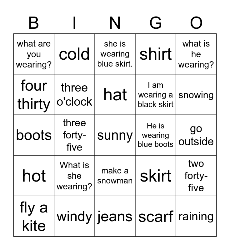 This bingo card has a free space and 24 words: fly a kite, What is she wearing?, hat, scarf, what is he wearing?, what are you wearing?, cold, she is wearing blue skirt., He is wearing blue boots, go outside, boots, three o'clock, skirt, two forty-five, four thirty, windy, jeans, shirt, snowing, hot, three forty-five, make a snowman, I am wearing a black skirt and raining.