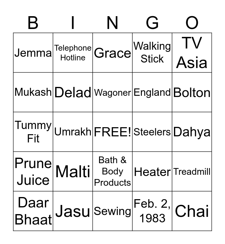 This bingo card has a free space and 24 words: Malti, Jasu, Wagoner, Daar Bhaat, TV Asia, Jemma, Mukash, Telephone Hotline, Steelers, Bath & Body Products, England, Tummy Fit, Heater, Treadmill, Delad, Feb. 2, 1983, Dahya, Grace, Bolton, Umrakh, Chai, Prune Juice, Walking Stick and Sewing.