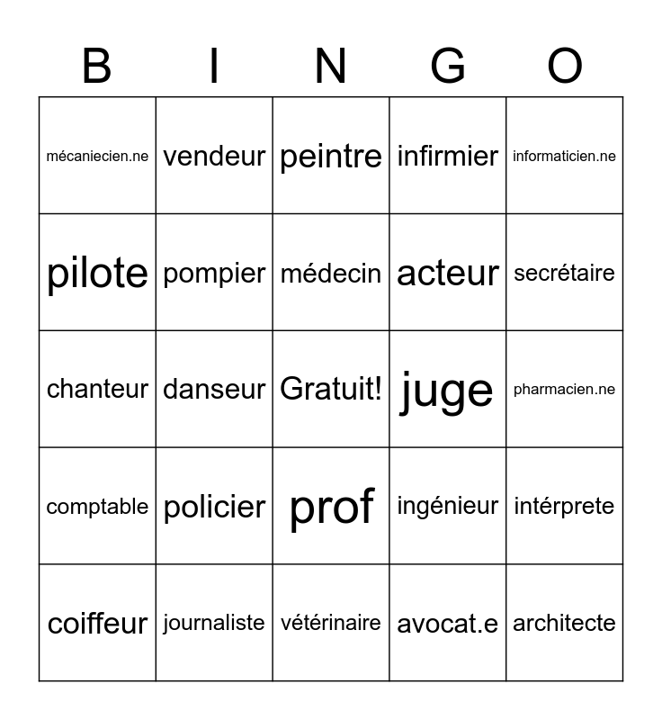 This bingo card has a free space and 26 words: prof, avocat.e, médecin, journaliste, informaticien.ne, mécaniecien.ne, pilote, vendeur, pharmacien.ne, ingénieur, acteur, chanteur, intérprete, coiffeur, danseur, homme/femme d'affaires, infirmier, comptable, peintre, architecte, secrétaire, vétérinaire, juge, policier, pompier and programmeur.