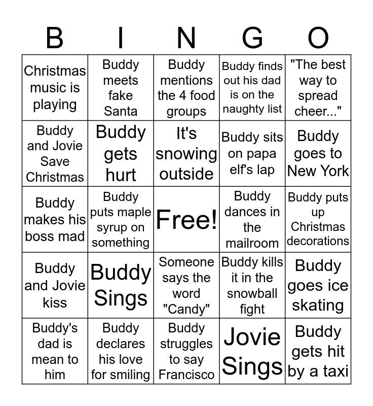This bingo card has a free space and 24 words: Buddy Sings, Buddy declares his love for smiling, It's snowing outside, Buddy's dad is mean to him, "The best way to spread cheer...", Christmas music is playing, Buddy and Jovie Save Christmas, Buddy meets fake Santa, Buddy dances in the mailroom, Someone says the word "Candy", Buddy sits on papa elf's lap, Buddy makes his boss mad, Buddy kills it in the snowball fight, Buddy goes ice skating, Buddy gets hurt, Jovie Sings, Buddy puts up Christmas decorations, Buddy mentions the 4 food groups, Buddy goes to New York, Buddy puts maple syrup on something, Buddy gets hit by a taxi, Buddy and Jovie kiss, Buddy finds out his dad is on the naughty list and Buddy struggles to say Francisco.