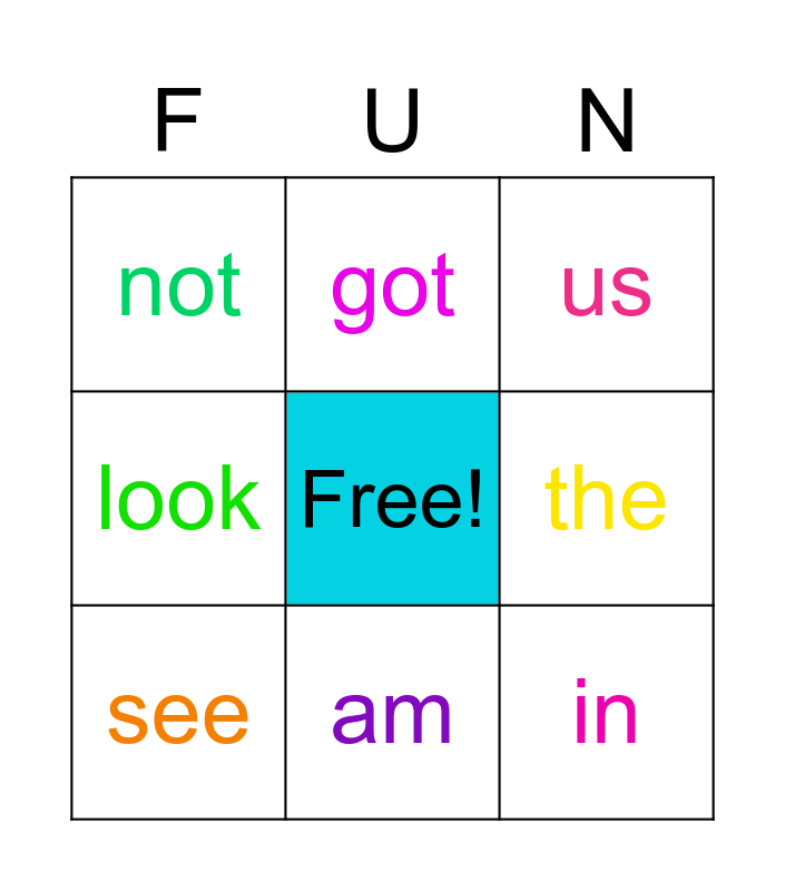 This bingo card has a free space and 14 words: he, no, see, got, look, in, it, is, am, not, and, the, us and get.