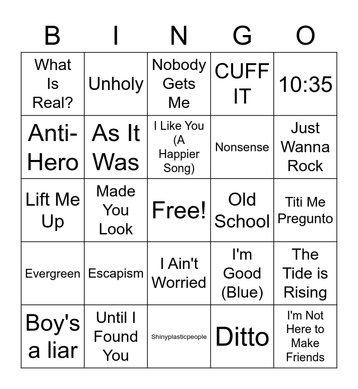 This bingo card has a free space and 50 words: Flowers, I'm Not Here to Make Friends, Creepin', Shinyplasticpeople, Escapism, Calm Down, Unholy, Reflections, Anti-Hero, golden hour, As It Was, CUFF IT, The Tide is Rising, I'm Good (Blue), Here With Me, Snooze, I Like You (A Happier Song), Old School, Lavender Haze, 10:35, Made You Look, Ditto, What Is Real?, Nonsense, Late Night Talking, Superhero, Just Wanna Rock, Queen of Belle la Vie, Nobody Gets Me, I Ain't Worried, STAR WALKIN', Rich Flex, Gold Leaf, La Bachata, Until I Found You, Something in the Orange, People, Mr. Invisible, Players, Titi Me Pregunto, THE LONELIEST, Bones, Die For You, Bad Habit, Boy's a liar, Lift Me Up, SNAP, How Do I Say Goodbye, Evergreen and DESPECHA.