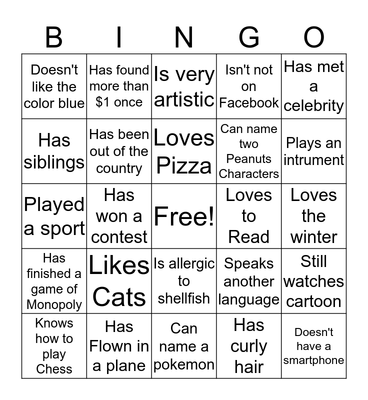 This bingo card has a free space and 24 words: Likes Cats, Has Flown in a plane, Loves Pizza, Knows how to play Chess, Has met a celebrity, Doesn't like the color blue, Has siblings, Has found more than $1 once, Loves to Read, Is allergic to shellfish, Can name two Peanuts Characters, Played a sport, Speaks another language, Still watches cartoon, Has been out of the country, Has curly hair, Loves the winter, Is very artistic, Plays an intrument, Has won a contest, Doesn't have a smartphone, Has finished a game of Monopoly, Isn't not on Facebook and Can name a pokemon.