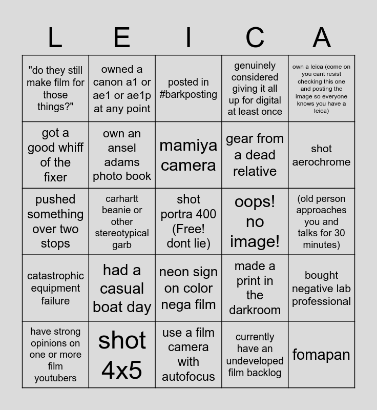 This bingo card has a free space and 24 words: had a casual boat day, shot 4x5, mamiya camera, have strong opinions on one or more film youtubers, own a leica (come on you cant resist checking this one and posting the image so everyone knows you have a leica), "do they still make film for those things?", got a good whiff of the fixer, owned a canon a1 or ae1 or ae1p at any point, oops! no image!, neon sign on color nega film, gear from a dead relative, pushed something over two stops, made a print in the darkroom, bought negative lab professional, own an ansel adams photo book, currently have an undeveloped film backlog, (old person approaches you and talks for 30 minutes), posted in #barkposting, shot aerochrome, carhartt beanie or other stereotypical garb, fomapan, catastrophic equipment failure, genuinely considered giving it all up for digital at least once and use a film camera with autofocus.