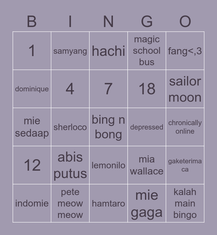 This bingo card has 25 words: abis putus, hamtaro, 7, indomie, fang<,3, 1, dominique, samyang, depressed, lemonilo, 18, mie sedaap, mia wallace, gaketerima ca, 4, kalah main bingo, chronically online, hachi, sailor moon, sherloco, bing n bong, pete meow meow, 12, magic school bus and mie gaga.