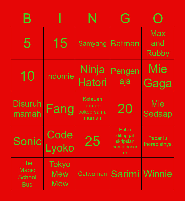 This bingo card has a free space and 24 words: Code Lyoko, Tokyo Mew Mew, Ninja Hatori, The Magic School Bus, Max and Rubby, 5, 10, 15, 20, 25, Pengen aja, Disuruh mamah, Habis ditinggal skripsian sama pacar rp, Pacar lu therapistnya, Indomie, Sarimi, Mie Sedaap, Samyang, Mie Gaga, Fang, Winnie, Sonic, Batman and Catwoman.
