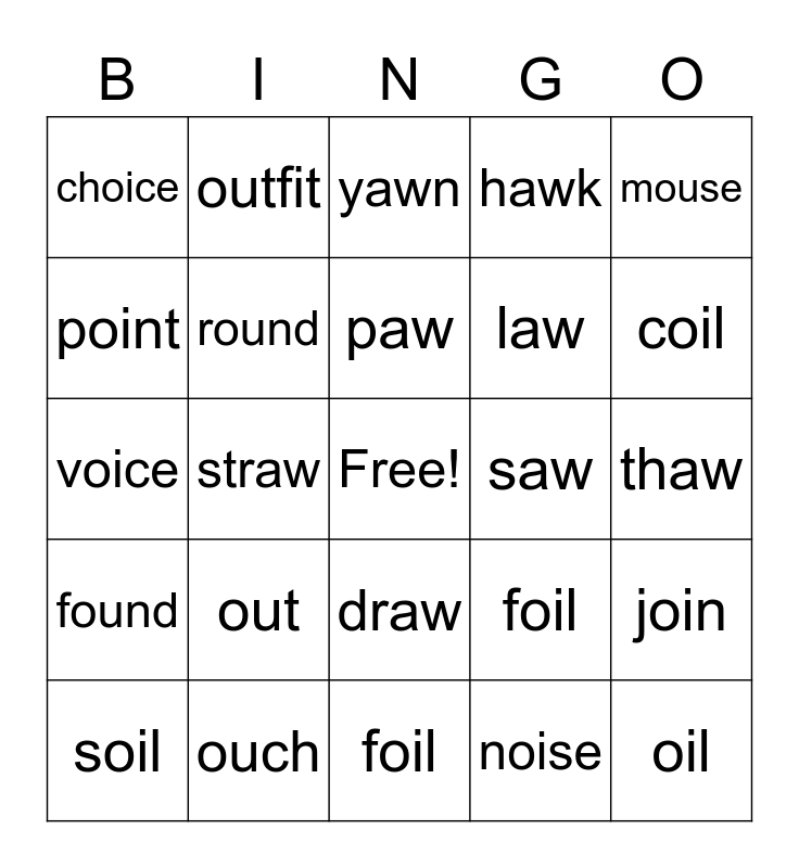 This bingo card has a free space and 34 words: coin, noise, outfit, cloud, found, round, mouse, soil, outfit, crawl, paw, yawn, claw, loud, saw, coil, ouch, voice, out, foil, draw, our, choice, thaw, foil, oil, hawk, boil, law, point, sound, straw, join and jaw.