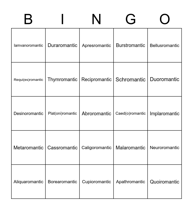 This bingo card has 45 words: Free!, Abroromantic, Aegoromantic, Aliquaromantic, Amicusromantic, Apathromantic, Apresromantic, Aromantic, Bellusromantic, Borearomantic, Burstromantic, Caed(o)romantic, Caligoromantic, Cassromantic, Ceaseromantic, Cupioromantic, Demiromantic, Desinoromantic, Dreadromantic, Duoromantic, Duraromantic, Frayromantic, Greyromantic, Iamvanoromantic, Idemromantic, Implaromantic, Inactoromantic, Limnoromantic, Malaromantic, Metaromantic, Nebularomantic, Neuroromantic, Noviromantic, Omniaromantic, Placioromantic, Plat(oni)romantic, Propeestromantic, Quasiromantic, Quoiromantic, Recipromantic, Requi(es)romantic, Schromantic, Singuluromantic, Thymromantic and Venusplatonic.