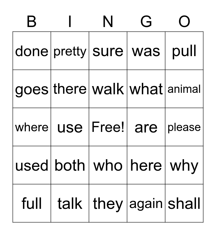 This bingo card has a free space and 24 words: both, talk, walk, full, pull, done, goes, pretty, are, who, what, where, here, why, there, again, please, sure, animal, use, shall, used, was and they.