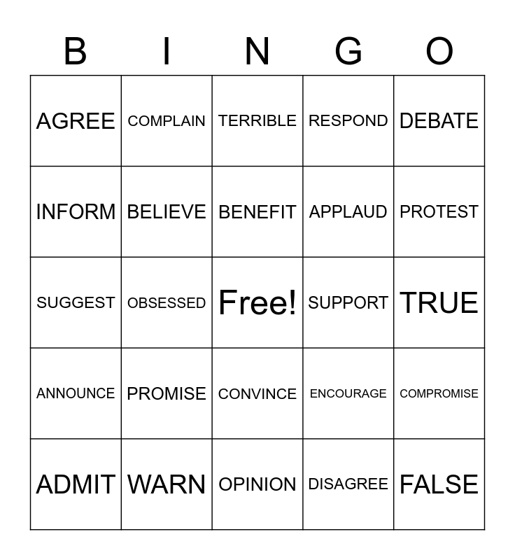 This bingo card has a free space and 31 words: OPINION, TRUST, OBSESSED, HABIT, AGREE, TERRIBLE, BELIEVE, ENCOURAGE, SUPPORT, DISAGREE, TRUE, FALSE, RESPECT, QUESTION, PROTEST, ARGUE, COMPROMISE, PROMISE, ANNOUNCE, CONVINCE, DEBATE, CHAT, ADMIT, COMPLAIN, APPLAUD, INFORM, RESPOND, SUGGEST, WARN, BENEFIT and FOCUS.