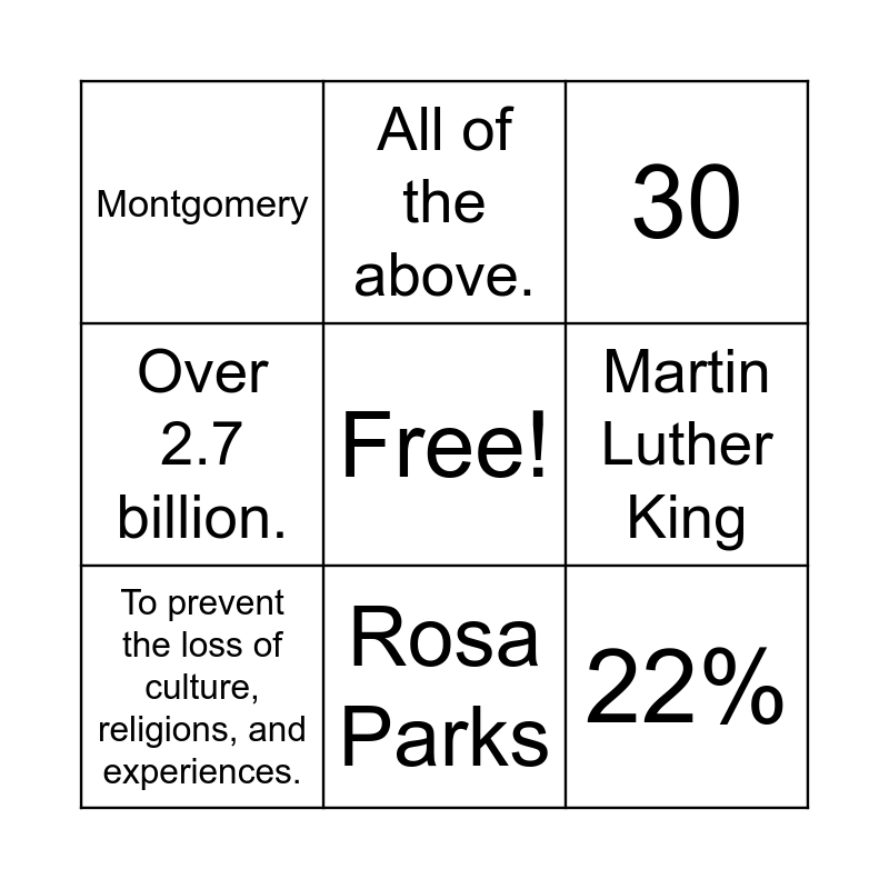 This bingo card has a free space and 13 words: Group members tends to dominate members of other groups., New Zealand in 1893., To prevent the loss of culture, religions, and experiences., All of the above., Over 2.7 billion., 22%, 71%, 1865, Rosa Parks, Montgomery, Martin Luther King, 30 and 80%.