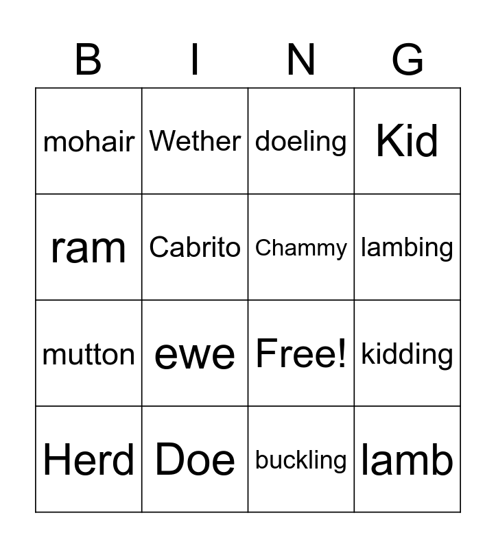 This bingo card has 22 words: Doe, Buck, Wether, Chevon, Cabrito, Chammy, mohair, doeling, Free!, lamb, mutton, Kid, wool, ovine, buckling, caprine, kidding, Herd, ewe, ram, lambing and Flock.