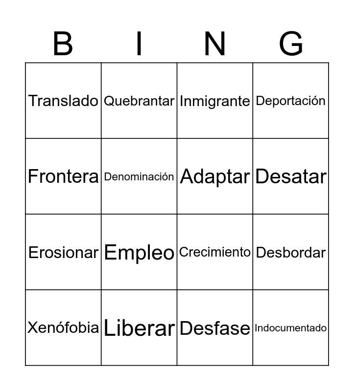 This bingo card has a free space and 15 words: Xenófobia, Indocumentado, Inmigrante, Translado, Desatar, Frontera, Empleo, Desfase, Denominación, Erosionar, Desbordar, Deportación, Adaptar, Quebrantar and Liberar.