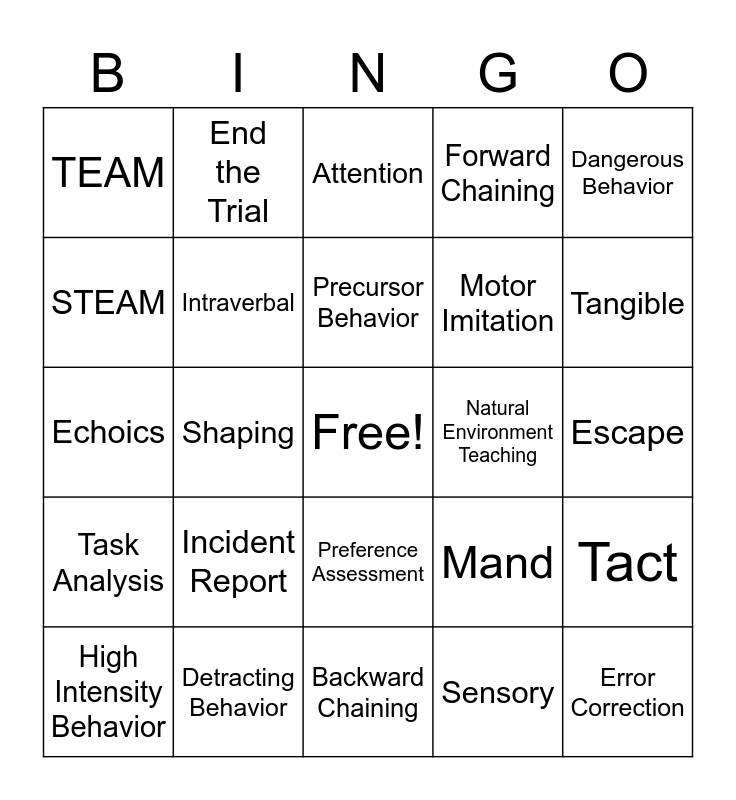 This bingo card has a free space and 24 words: Incident Report, Detracting Behavior, Precursor Behavior, High Intensity Behavior, Dangerous Behavior, TEAM, STEAM, End the Trial, Natural Environment Teaching, Preference Assessment, Motor Imitation, Echoics, Mand, Tact, Intraverbal, Sensory, Escape, Attention, Tangible, Shaping, Error Correction, Task Analysis, Forward Chaining and Backward Chaining.