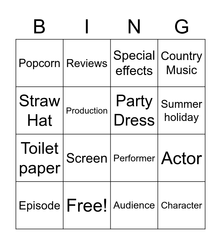 This bingo card has 16 words: Free!, Actor, Special effects, Popcorn, Toilet paper, Reviews, Performer, Audience, Straw Hat, Production, Episode, Country Music, Screen, Summer holiday, Party Dress and Character.