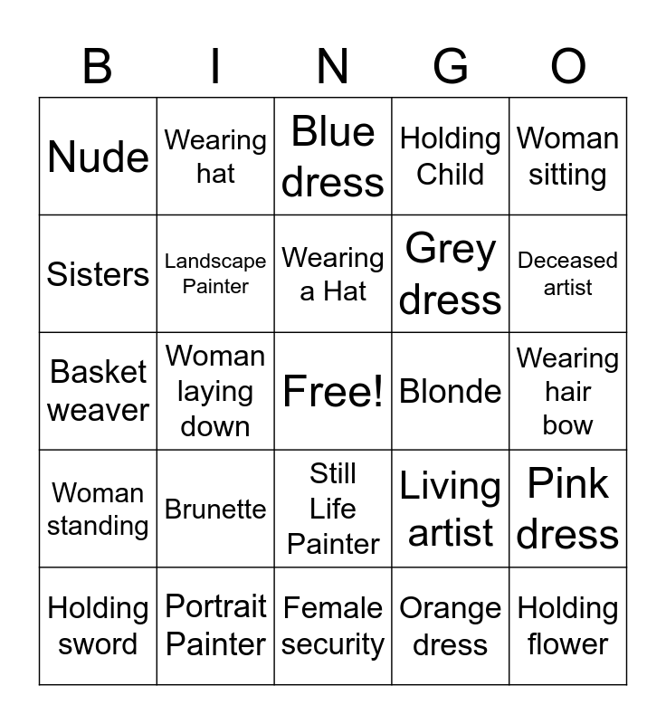 This bingo card has a free space and 40 words: GABBY COMMUNITY PROGRAMS SPECIALIST, Basket weaver, Ceramist, Landscape Painter, Portrait Painter, Still Life Painter, Wearing a Hat, Wearing a Dress, Woman sitting, Woman standing, Woman laying down, Holding Child, Holding flower, Wearing hair bow, Blonde, Brunette, Playing piano, Nude, Wearing veil, Blue dress, Pink dress, Orange dress, Grey dress, Sisters, Young girl, Mother, Woman outdoors, Woman indoors, Glassware artist, Gallery named after woman, Book/catalog writer, Holding sword, Starfish on her, Living artist, Deceased artist, Female security, Wearing jewelry, Wearing gloves, Wearing hat and Statue.