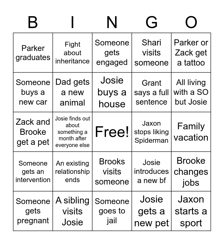 This bingo card has a free space and 25 words: Someone gets pregnant, An existing relationship ends, Josie buys a house, Josie gets a new pet, All living with a SO but Josie, Parker graduates, Fight about inheritance, Someone gets engaged, Grant says a full sentence, Brooke changes jobs, Zack and Brooke get a pet, Dad gets a new animal, Josie introduces a new bf, Jaxon starts a sport, Someone buys a new car, A sibling visits Josie, Someone goes to jail, Shari visits someone, Family vacation, Someone gets an intervention, Josie finds out about something a month after everyone else, Brooks visits someone, Jaxon stops liking Spiderman, Parker or Zack get a tattoo and Parker or Zack get a tattoo.