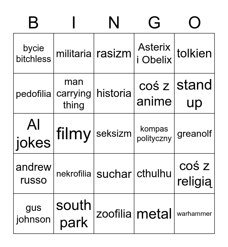 This bingo card has a free space and 24 words: nekrofilia, south park, historia, gus johnson, tolkien, bycie bitchless, pedofilia, militaria, kompas polityczny, suchar, coś z anime, Al jokes, cthulhu, coś z religią, man carrying thing, metal, greanolf, rasizm, stand up, filmy, warhammer, andrew russo, Asterix i Obelix and zoofilia.