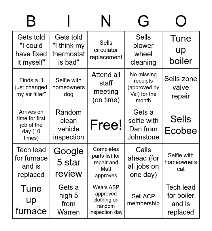 This bingo card has a free space and 24 words: Google 5 star review, Gets a high 5 from Warren, Attend all staff meeting (on time), Tune up furnace, Tune up boiler, Gets told "I could have fixed it myself", Finds a "I just changed my air filter", Gets told "I think my thermostat is bad", Gets a selfie with Dan from Johnstone, Completes parts list for repair and Matt approves, No missing receipts (approved by Val) for the month, Arrives on time for first job of the day (10 times), Calls ahead (for all jobs on one day), Selfie with homeowners cat, Selfie with homeowners dog, Sell ACP membership, Sells Ecobee, Sells circulator replacement, Sells zone valve repair, Random clean vehicle inspection, Tech lead for boiler and is replaced, Tech lead for furnace and is replaced, Sells blower wheel cleaning and Wears ASP approved clothing on random inspection day.