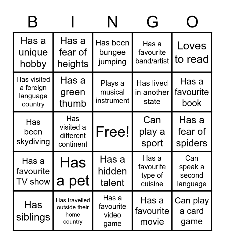This bingo card has a free space and 24 words: Has a pet, Has travelled outside their home country, Plays a musical instrument, Has siblings, Loves to read, Has a unique hobby, Has visited a foreign language country, Has a fear of heights, Can play a sport, Has a hidden talent, Has lived in another state, Has been skydiving, Has a favourite type of cuisine, Can speak a second language, Has a green thumb, Has a favourite movie, Has a fear of spiders, Has been bungee jumping, Has a favourite book, Has visited a different continent, Can play a card game, Has a favourite TV show, Has a favourite band/artist and Has a favourite video game.