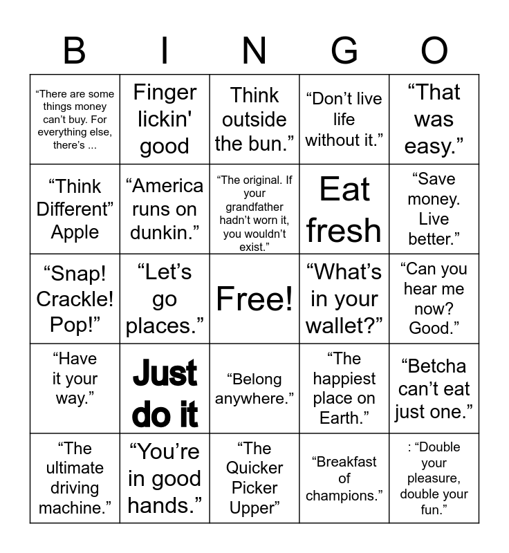 This bingo card has a free space and 24 words: Just do it, “You’re in good hands.”, “The original. If your grandfather hadn’t worn it, you wouldn’t exist.”, “The ultimate driving machine.”, “That was easy.”, “There are some things money can’t buy. For everything else, there’s ..., “Think Different” Apple, Finger lickin' good, “What’s in your wallet?”, “Belong anywhere.”, Eat fresh, “Snap! Crackle! Pop!”, “The happiest place on Earth.”, “Betcha can’t eat just one.”, “America runs on dunkin.”, “Breakfast of champions.”, “Can you hear me now? Good.”, Think outside the bun.”, “Save money. Live better.”, “Let’s go places.”, : “Double your pleasure, double your fun.”, “Have it your way.”, “Don’t live life without it.” and “The Quicker Picker Upper”.