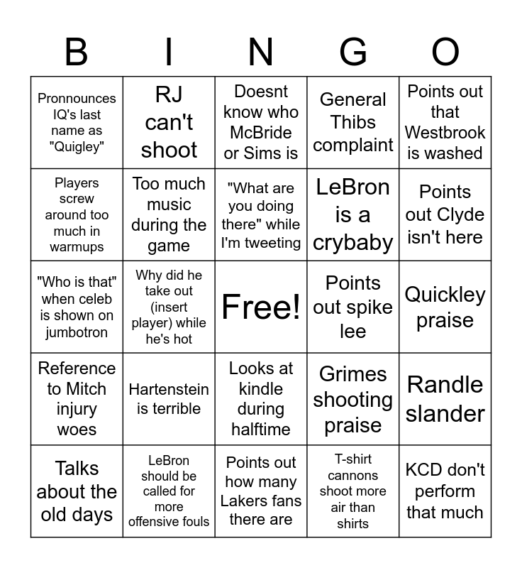 This bingo card has a free space and 24 words: Hartenstein is terrible, LeBron should be called for more offensive fouls, "What are you doing there" while I'm tweeting, Talks about the old days, Points out that Westbrook is washed, Pronnounces IQ's last name as "Quigley", Players screw around too much in warmups, RJ can't shoot, Points out spike lee, Looks at kindle during halftime, LeBron is a crybaby, "Who is that" when celeb is shown on jumbotron, Grimes shooting praise, Randle slander, Too much music during the game, T-shirt cannons shoot more air than shirts, Quickley praise, Doesnt know who McBride or Sims is, Points out Clyde isn't here, Why did he take out (insert player) while he's hot, KCD don't perform that much, Reference to Mitch injury woes, General Thibs complaint and Points out how many Lakers fans there are.