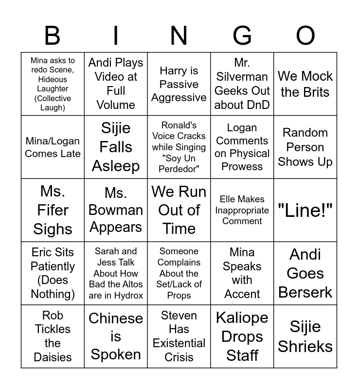 This bingo card has 28 words: Andi Goes Berserk, Maddie Does Homework, Logan Comments on Physical Prowess, Kaliope Drops Staff, Mina/Logan Comes Late, Harry is Passive Aggressive, Andi Plays Video at Full Volume, Eric Sits Patiently (Does Nothing), Elle Makes Inappropriate Comment, Rob Tickles the Daisies, Ms. Fifer Sighs, Mr. Silverman Geeks Out about DnD, Chinese is Spoken, Steven Has Existential Crisis, Random Person Shows Up, Logan Does Pistol Squat, Sarah and Jess Talk About How Bad the Altos are in Hydrox, Sijie Falls Asleep, Ronald's Voice Cracks while Singing "Soy Un Perdedor", Someone Complains About the Set/Lack of Props, Mina asks to redo Scene, Hideous Laughter (Collective Laugh), Sijie Shrieks, We Run Out of Time, Ms. Bowman Appears, "Line!", Mina Speaks with Accent, We Mock the Brits and The Door Locks.