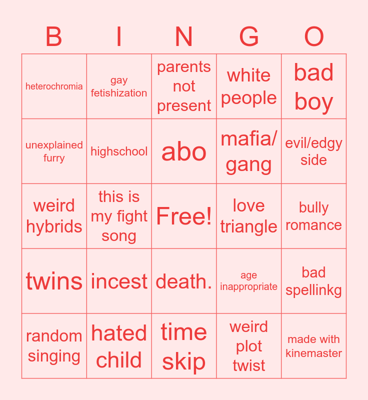 This bingo card has a free space and 24 words: incest, hated child, abo, random singing, bad boy, heterochromia, unexplained furry, gay fetishization, love triangle, death., mafia/ gang, weird hybrids, age inappropriate, bad spellinkg, highschool, weird plot twist, bully romance, parents not present, evil/edgy side, this is my fight song, made with kinemaster, twins, white people and time skip.