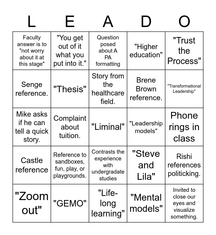 This bingo card has 43 words: Free!, "Liminal", "Honoured", "Zoom out", Group is encouarge to "embrace vulernability", "Mental models", Question posed about APA formatting, Faculty reminisces about the 90s, "Trust the Process", "GEMO", "Higher education", "Leadership models", Contrasts the experience with undergradate studies, Reference to sandboxes, fun, play, or playgrounds., Reference to adult learning theory, "Life-long learning", "Change the world", Mike asks if he can tell a quick story., Group is encouraged to use a "____ lens", "Transformational Leadership", "You get out of it what you put into it.", Faculty uses a bell to get the groups attention, Anyone makes fun of MBAs or said they considered doing an MBA., Faculty answer is to "not worry about it at this stage", Anyone encourages "self care" to the group, Phone rings in class, Peacock reference, "Gratitude", "Steve and Lila", Castle reference, Someone opens a noisy snack., Rishi references politicking., Speaker gets choked up., Complaint about tuition., Someone raises their hand but keeps talking., Alcohol reference., Invited to close our eyes and visualize something., Story from the healthcare field., Senge reference., Brene Brown reference., Presenter swears., "Thesis" and "Systems Thinking".