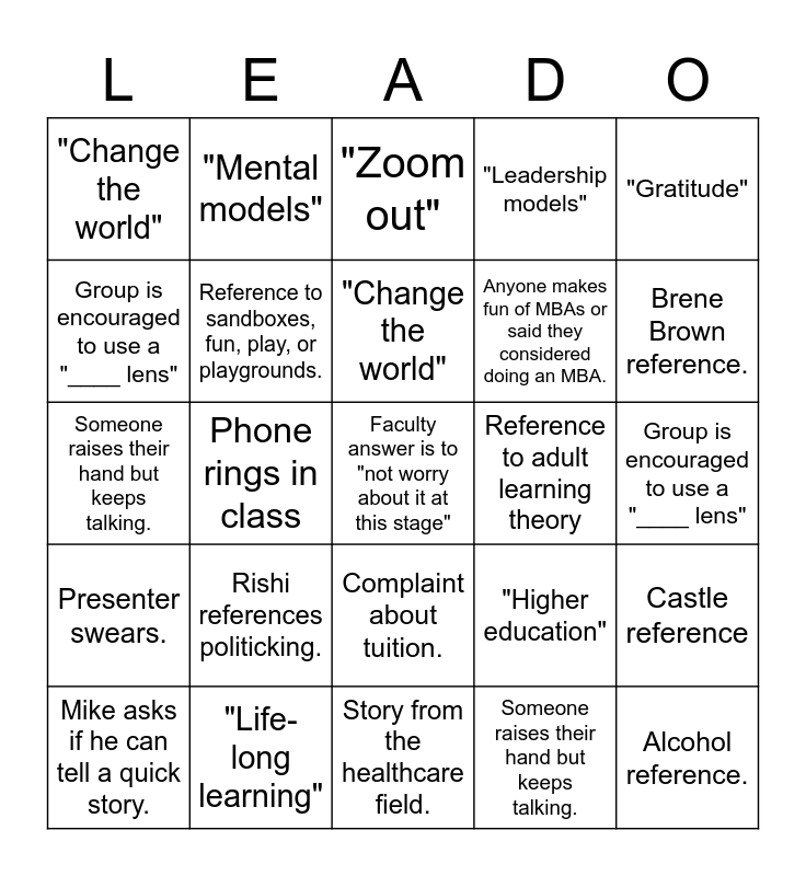 ⚠ This card has duplicate items: "Liminal" (2), "Honoured" (2), "Zoom out" (2), Group is encouarge to "embrace vulernability" (2), "Mental models" (2), Question posed about APA formatting (2), Faculty reminisces about the 90s (2), "Trust the Process" (2), "GEMO" (2), "Higher education" (2), "Leadership models" (2), Contrasts the experience with undergradate studies (2), Reference to sandboxes, fun, play, or playgrounds. (2), Reference to adult learning theory (2), "Life-long learning" (2), "Change the world" (2), Mike asks if he can tell a quick story. (2), Group is encouraged to use a "____ lens" (2), "Transformational Leadership" (2), "You get out of it what you put into it." (2), Faculty uses a bell to get the groups attention (2), Anyone makes fun of MBAs or said they considered doing an MBA. (2), Faculty answer is to "not worry about it at this stage" (2), Anyone encourages "self care" to the group (2), Phone rings in class (2), Peacock reference (2), "Gratitude" (2), "Steve and Lila" (2), Castle reference (2), Someone opens a noisy snack. (2), Rishi references politicking. (2), Speaker gets choked up. (2), Complaint about tuition. (2), Someone raises their hand but keeps talking. (2), Alcohol reference. (2), Invited to close our eyes and visualize something. (2), Story from the healthcare field. (2), Senge reference. (2), Brene Brown reference. (2), Presenter swears. (2), "Thesis" (2), "Systems Thinking" (2)