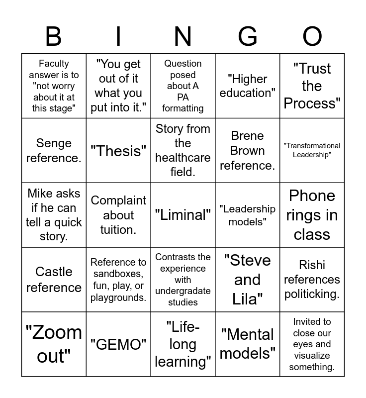 This bingo card has 43 words: Free!, "Liminal", "Honoured", "Zoom out", Group is encouarge to "embrace vulernability", "Mental models", Question posed about APA formatting, Faculty reminisces about the 90s, "Trust the Process", "GEMO", "Higher education", "Leadership models", Contrasts the experience with undergradate studies, Reference to sandboxes, fun, play, or playgrounds., Reference to adult learning theory, "Life-long learning", "Change the world", Mike asks if he can tell a quick story., Group is encouraged to use a "____ lens", "Transformational Leadership", "You get out of it what you put into it.", Faculty uses a bell to get the groups attention, Anyone makes fun of MBAs or said they considered doing an MBA., Faculty answer is to "not worry about it at this stage", Anyone encourages "self care" to the group, Phone rings in class, Peacock reference, "Gratitude", "Steve and Lila", Castle reference, Someone opens a noisy snack., Rishi references politicking., Speaker gets choked up., Complaint about tuition., Someone raises their hand but keeps talking., Alcohol reference., Invited to close our eyes and visualize something., Story from the healthcare field., Senge reference., Brene Brown reference., Presenter swears., "Thesis" and "Systems Thinking".