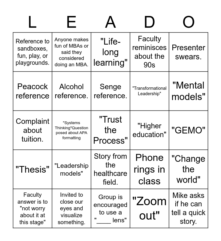 This bingo card has 41 words: Speaker gets choked up., Complaint about tuition., Someone raises their hand but keeps talking., Alcohol reference., Invited to close our eyes and visualize something., Story from the healthcare field., Senge reference., Brene Brown reference., Presenter swears., "Thesis", "Systems Thinking"Question posed about APA formatting, Faculty reminisces about the 90s, "Trust the Process", "GEMO", "Higher education", "Leadership models", Contrasts the experience with undergradate studies, Reference to sandboxes, fun, play, or playgrounds., Reference to adult learning theory, "Life-long learning", "Change the world", Mike asks if he can tell a quick story., Group is encouraged to use a "____ lens", "Transformational Leadership", "Liminal", "Honoured", "Zoom out", Group is encouarge to "embrace vulernability", "Mental models", "You get out of it what you put into it.", Faculty uses a bell to get the groups attention, Anyone makes fun of MBAs or said they considered doing an MBA., Faculty answer is to "not worry about it at this stage", Anyone encourages "self care" to the group, Phone rings in class, Peacock reference, "Gratitude", "Steve and Lila", Castle reference, Someone opens a noisy snack. and Rishi references politicking.`.