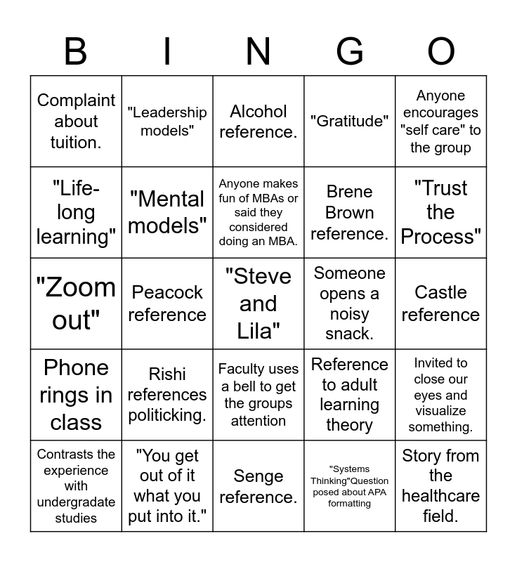 This bingo card has 41 words: "Honoured", "Zoom out", Group is encouarge to "embrace vulernability", "Mental models", "You get out of it what you put into it.", Faculty uses a bell to get the groups attention, Anyone makes fun of MBAs or said they considered doing an MBA., Faculty answer is to "not worry about it at this stage", Anyone encourages "self care" to the group, Phone rings in class, Peacock reference, "Gratitude", "Steve and Lila", Castle reference, Someone opens a noisy snack., Rishi references politicking., Speaker gets choked up., Complaint about tuition., Someone raises their hand but keeps talking., Alcohol reference., Invited to close our eyes and visualize something., Story from the healthcare field., Senge reference., Brene Brown reference., Presenter swears., "Thesis", "Systems Thinking"Question posed about APA formatting, Faculty reminisces about the 90s, "Trust the Process", "GEMO", "Higher education", "Leadership models", Contrasts the experience with undergradate studies, Reference to sandboxes, fun, play, or playgrounds., Reference to adult learning theory, "Life-long learning", "Change the world", Mike asks if he can tell a quick story., Group is encouraged to use a "____ lens", "Transformational Leadership" and "Liminal".