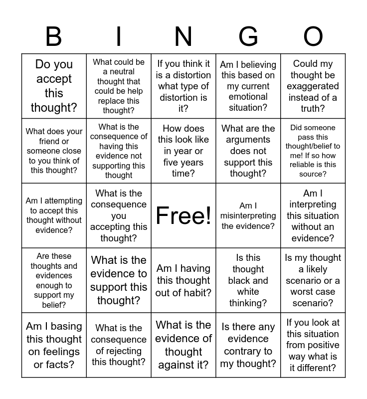 This bingo card has a free space and 24 words: What is the evidence to support this thought?, What is the consequence of rejecting this thought?, How does this look like in year or five years time?, Am I basing this thought on feelings or facts?, Could my thought be exaggerated instead of a truth?, Do you accept this thought?, What does your friend or someone close to you think of this thought?, What could be a neutral thought that could be help replace this thought?, Am I misinterpreting the evidence?, Am I having this thought out of habit?, What are the arguments does not support this thought?, Am I attempting to accept this thought without evidence?, Is this thought black and white thinking?, Is my thought a likely scenario or a worst case scenario?, What is the consequence of having this evidence not supporting this thought, Is there any evidence contrary to my thought?, Am I interpreting this situation without an evidence?, If you think it is a distortion what type of distortion is it?, Did someone pass this thought/belief to me! If so how reliable is this source?, What is the consequence you accepting this thought?, If you look at this situation from positive way what is it different?, Are these thoughts and evidences enough to support my belief?, Am I believing this based on my current emotional situation? and What is the evidence of thought against it?.