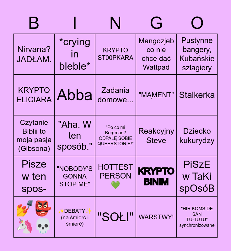 This bingo card has 25 words: "NOBODY'S GONNA STOP ME", "SOŁI", Zadania domowe..., 💅👺🦄💀, Pustynne bangery, Kubańskie szlagiery, Nirvana? JADŁAM., KRYPTO ELICIARA, *crying in bleble*, Reakcyjny Steve, HOTTEST PERSON💚, "MĄMENT", Czytanie Biblii to moja pasja (Gibsona), KRYPTO BINIM, PiSzE w TaKi spOsóB, Abba, "HIR KOMS DE SAN TU-TUTU" synchronizowane, Dziecko kukurydzy, KRYPTO ST00PKARA, Stalkerka, "Aha. W ten sposób.", "Po co mi Bergman? ODPALĘ SOBIE QUEERSTORIE!", ✨DEBATY✨ (na śmierć i śmierć), Pisze w ten spos-, Mangozjeb co nie chce dać Wattpad and WARSTWY!.