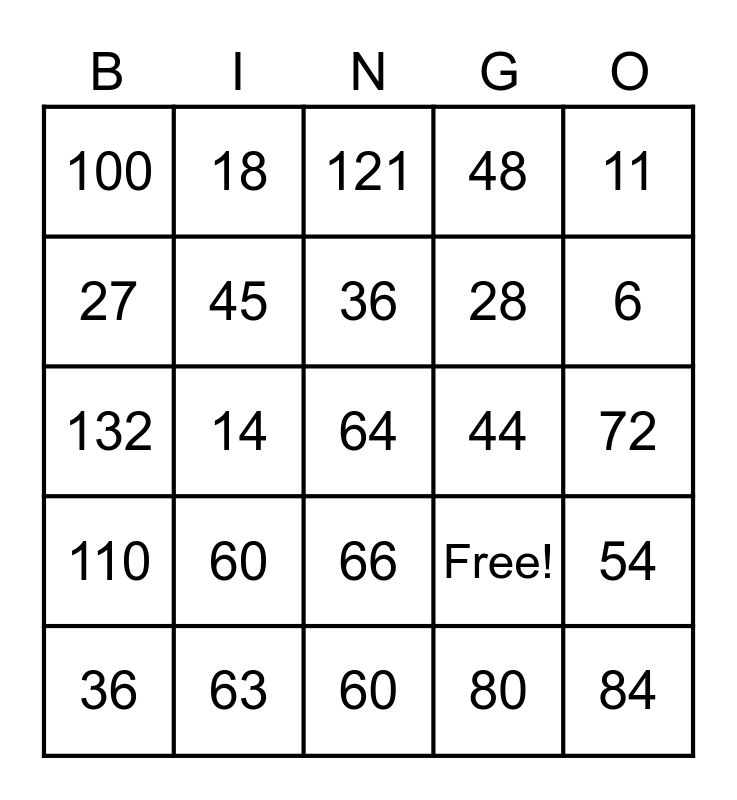 This bingo card has 25 words: 60, 60, 36, 36, 11, 100, 27, 18, 44, 66, 28, 132, Free!, 54, 45, 84, 72, 121, 6, 14, 64, 63, 110, 48 and 80.