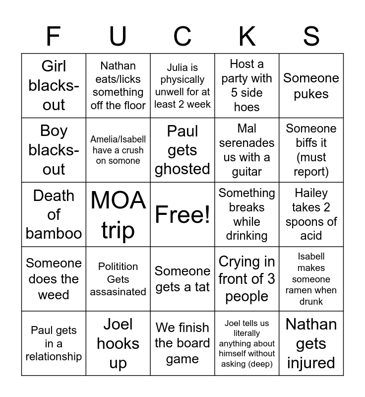 This bingo card has a free space and 24 words: Politition Gets assasinated, Joel hooks up, Paul gets ghosted, Paul gets in a relationship, Someone pukes, Girl blacks-out, Boy blacks-out, Nathan eats/licks something off the floor, Something breaks while drinking, Someone gets a tat, Mal serenades us with a guitar, Death of bamboo, Crying in front of 3 people, Isabell makes someone ramen when drunk, Amelia/Isabell have a crush on somone, Joel tells us literally anything about himself without asking (deep), Hailey takes 2 spoons of acid, Julia is physically unwell for at least 2 week, Someone biffs it (must report), MOA trip, Nathan gets injured, Someone does the weed, Host a party with 5 side hoes and We finish the board game.