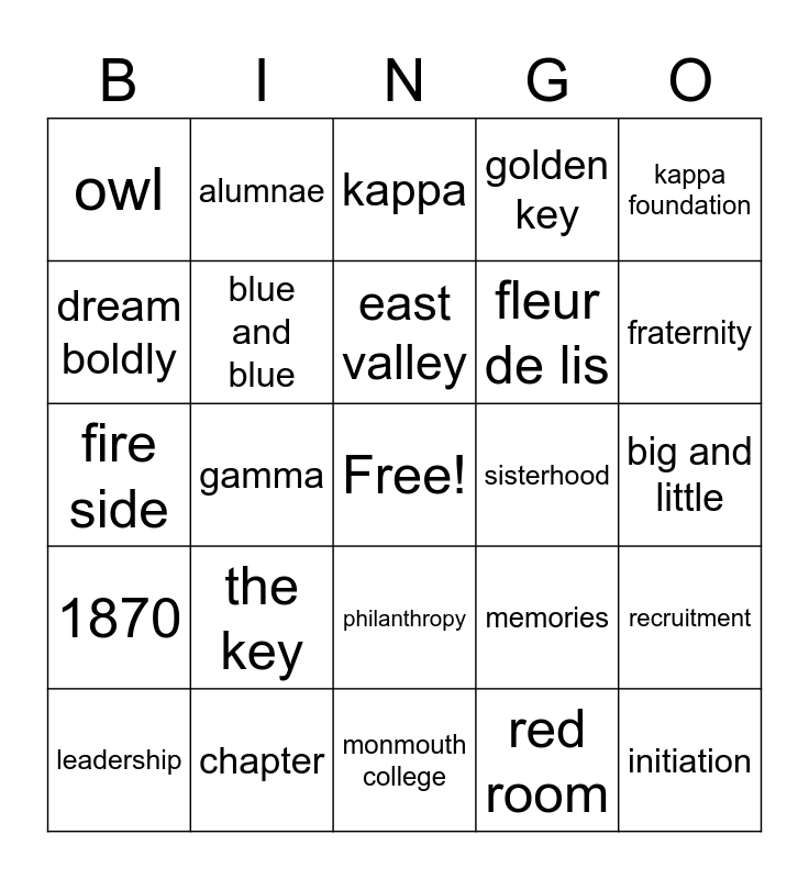 This bingo card has a free space and 24 words: the key, chapter, east valley, leadership, kappa foundation, owl, dream boldly, alumnae, sisterhood, philanthropy, fleur de lis, fire side, memories, recruitment, blue and blue, red room, big and little, kappa, fraternity, gamma, initiation, 1870, golden key and monmouth college.