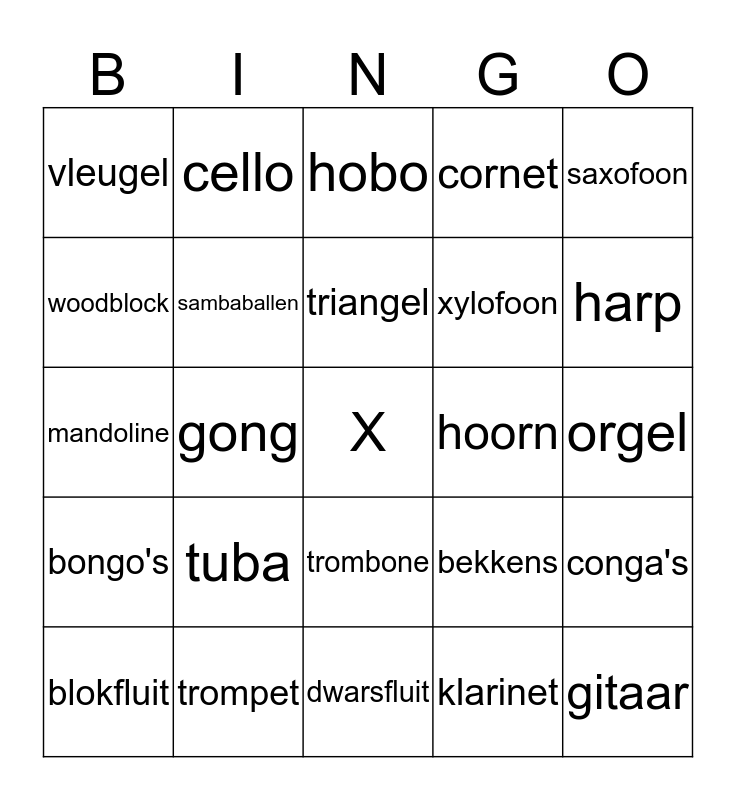This bingo card has a free space and 43 words: doedelzak, gitaar, viool, blokfluit, accordeon, klarinet, hobo, fagot, saxofoon, trompet, cornet, hoorn, trombone, tuba, piccolo, dwarsfluit, panfluit, mandoline, banjo, harp, cello, contrabas, piano, vleugel, klavecimbel, orgel, keyboard, trom, bekkens, bongo's, buisklokken, conga's, djembe, gong, pauk, tamboerijn, timbales, triangel, woodblock, xylofoon, drumstel, sambaballen and mondharmonica.