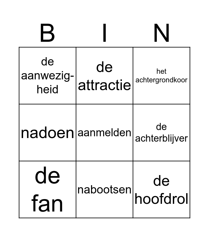 This bingo card has a free space and 8 words: de achterblijver, het achtergrondkoor, de attractie, de fan, de aanwezig-heid, de hoofdrol, nadoen and nabootsen.