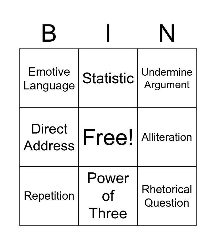 This bingo card has a free space and 11 words: Powerful Opening, Power of Three, Rhetorical Question, Repetition, Statistic, Undermine Argument, Alliteration, Anecdote, Direct Address, Emotive Language and Exaggeration.