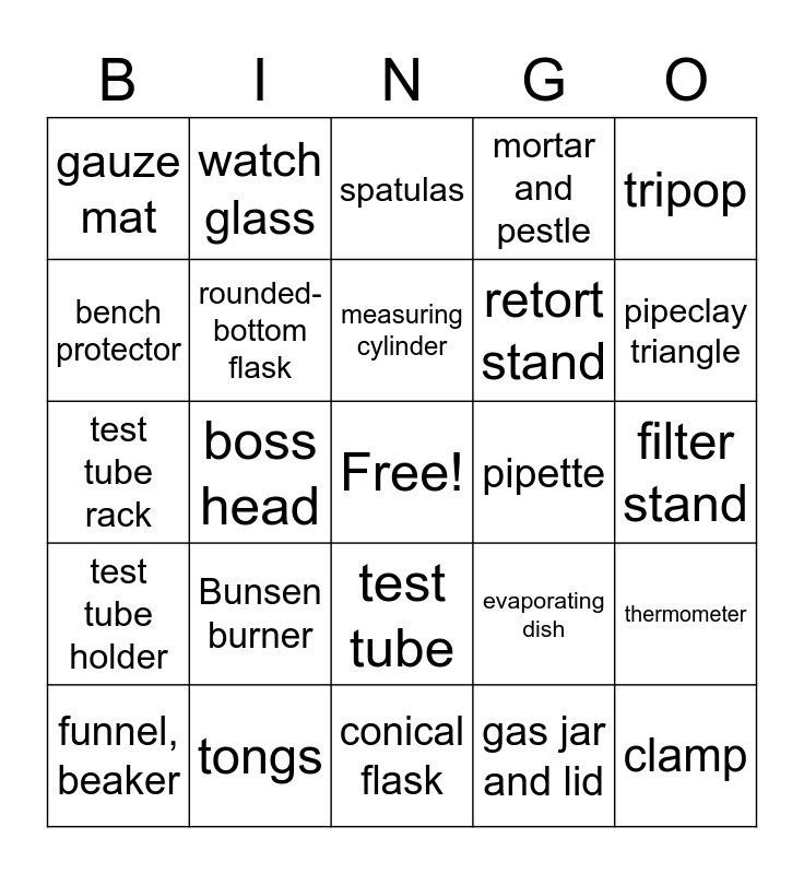 This bingo card has a free space and 25 words: Bunsen burner, conical flask, measuring cylinder, funnel, beaker, tripop, gauze mat, bench protector, watch glass, pipette, test tube, retort stand, test tube rack, evaporating dish, thermometer, rounded-bottom flask, flat-bottomed flask, filter stand, spatulas, pipeclay triangle, boss head, clamp, tongs, test tube holder, mortar and pestle and gas jar and lid.