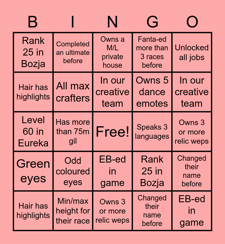 This bingo card has a free space and 67 words: Odd coloured eyes, Green eyes, Fanta-ed more than 3 races before, Changed their name before, Min/max height for their race, Wearing glasses, Completed an ultimate before, Owns a M/L private house, In our creative team, Owns a mogstation mount, EB-ed in game, Completed P8s P2, Owns 3 or more relic weps, Unlocked all jobs, Owns 100 or more minions, Hair has highlights, Has more than 75m gil, Rank 25 in Bozja, Level 60 in Eureka, Owns 5 dance emotes, Odd coloured eyes, Green eyes, Fanta-ed more than 3 races before, Changed their name before, Min/max height for their race, Wearing glasses, Completed an ultimate before, Owns a M/L private house, In our creative team, Owns 2 mogstation mounts, EB-ed in game, Completed P8s P2, Owns 3 or more relic weps, Unlocked all jobs, Owns 100 or more minions, Hair has highlights, Has more than 75m gil, Rank 25 in Bozja, Level 60 in Eureka, Owns 5 dance emotes, Guardian is Azeyma, All max crafters, Speaks 3 languages, Odd coloured eyes, Green eyes, Fanta-ed more than 3 races before, Changed their name before, Min/max height for their race, Wearing glasses, Completed an ultimate before, Owns a M/L private house, In our creative team, Owns 2 mogstation mounts, EB-ed in game, Completed P8s P2, Owns 3 or more relic weps, Unlocked all jobs, Owns 100 or more minions, Hair has highlights, Has more than 75m gil, Rank 25 in Bozja, Level 60 in Eureka, Owns 5 dance emotes, Guardian is Azeyma, All max crafters, Speaks 3 languages and MK is first venue to have worked in.